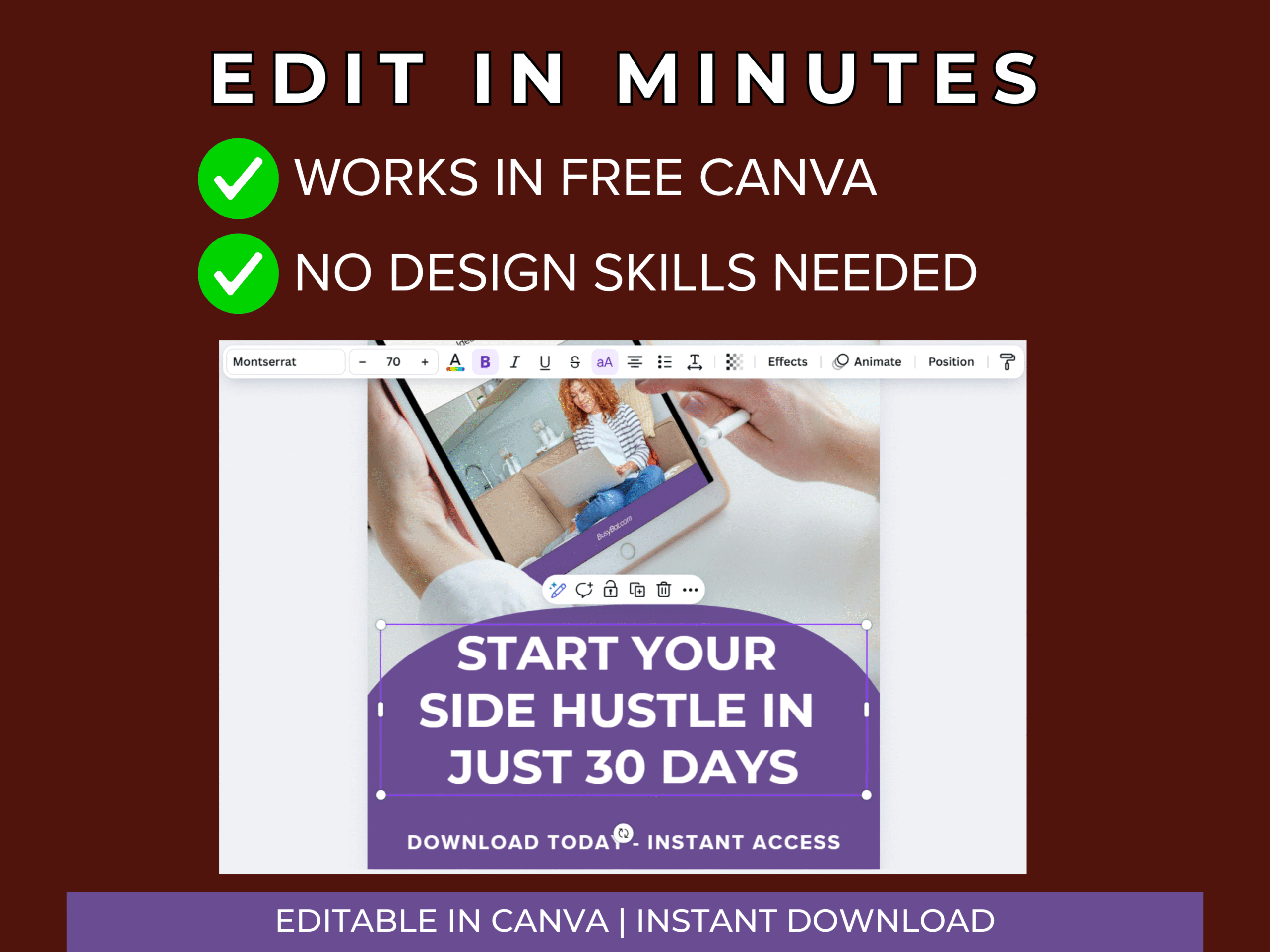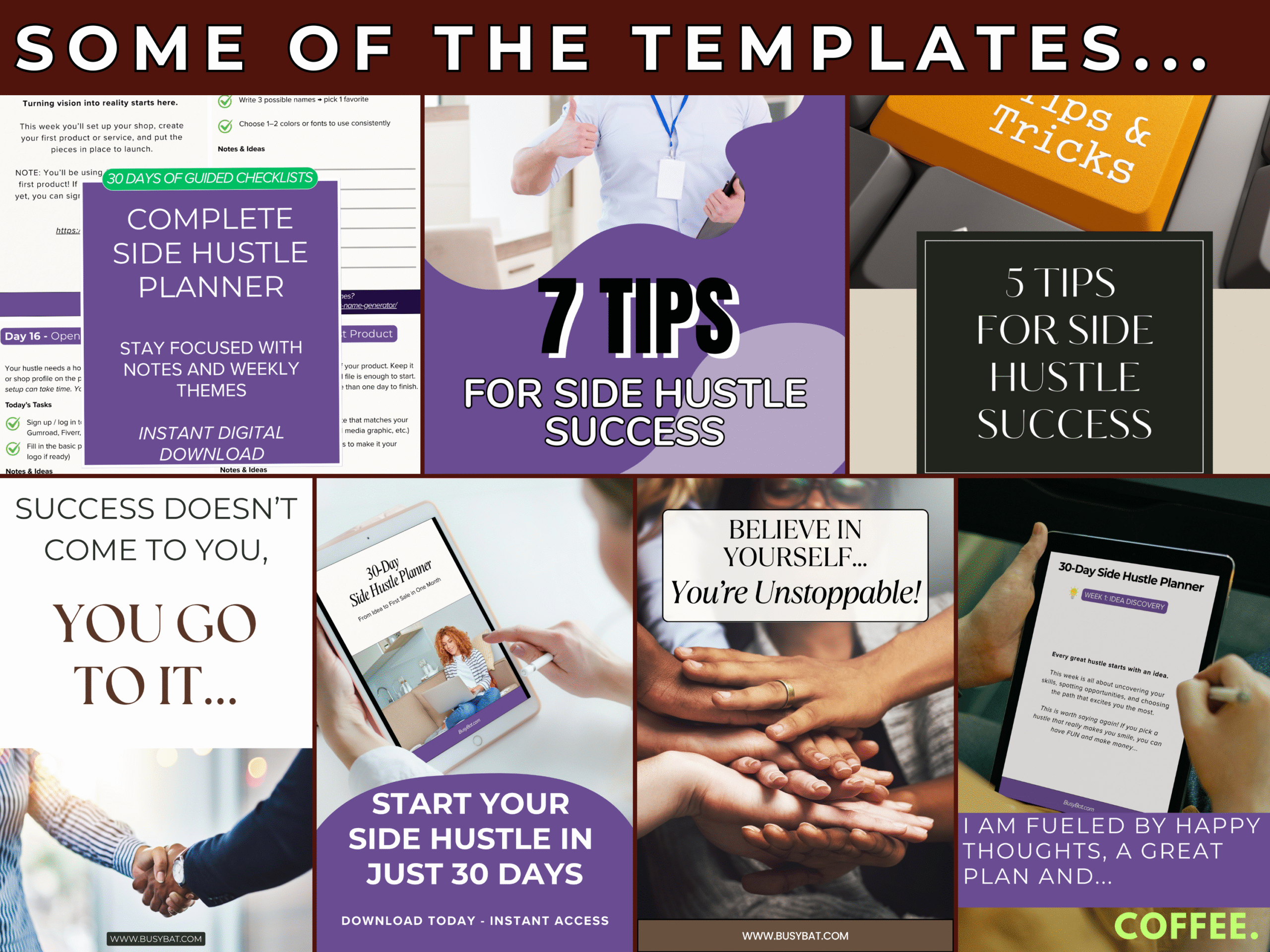 This Pinterest Template Kit for Canva includes 26 editable designs created for side hustlers, bloggers, Etsy sellers, and small business owners who want consistent, eye-catching pins without spending hours designing.